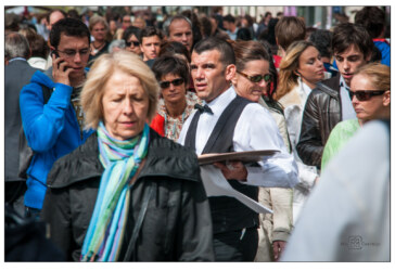 Das Zentrum von Paris ist geschäftig und voll. Seine wahren Helden sind die Kellner, die ihr rundes Tablett einhändig noch durch den dichtesten Strom von Passanten zu den Tischen auf der anderen Seite des Gehsteiges manövrieren.
